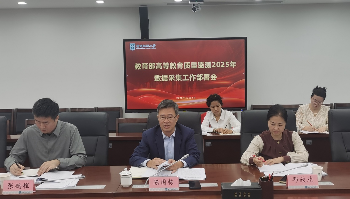 陈国栋强调,高等教育教学质量监测数据是国家对高校办学水平进行常态化监测评价的核心数据,是推动人才培养质量全面提升的重要举措。必须深刻认识此项工作是服务国家教育数字化战略行动、构建高质量教育体系的基础性工程,直接关乎学校的核心竞争力和长远发展。陈国栋在讲话中提出三点要求:第一,统一思想,深刻认识数据采集工作的战略价值和时代意义。要站在推动学校高质量发展、服务教育强国建设高度审视和推进数据采集工作。本次数据采集首次通过“国家教育大数据中心部校数据网络”平台进行,实现学校、学科、专业三级数据全面贯通,对学校优化学科专业布局、推进教育教学改革具有前所未有的重要意义。本次采集数据,不仅是下一轮本科教育教学审核评估的重要基础,更是学校研判发展态势、优化资源配置、编制“十五五”规划的核心依据,各相关单位要高度重视,务必跳出“常规工作”认知,以基础性、战略性、全局性的高度抓实抓好此次工作。第二,压实主体责任,构建协同高效的工作机制。各单位“一把手”是数据质量的第一责任人,务必亲自部署、亲自过问。将任务分解到岗、细化到人。时间紧任务重,牵头部门要加强统筹,建立定期的跨部门沟通协商机制,形成齐抓共管的工作合力,严格按照工作时间安排进行数据填报。第三,坚守质量底线,强化数据赋能应用。本次数据填报需确保真实、准确、完整、规范,既要与高基表、国家大学生就业服务平台填报信息、全国来华留学管理信息系统填报信息等上报数据保持一致,又要优化关键指标,杜绝虚假填报。要以此次采集为契机,同步做好数据挖掘、分析与应用,精准诊断学科专业发展的优势与短板,切实让数据成为驱动学校治理现代化、赋能内涵式高质量发展的智慧引擎。